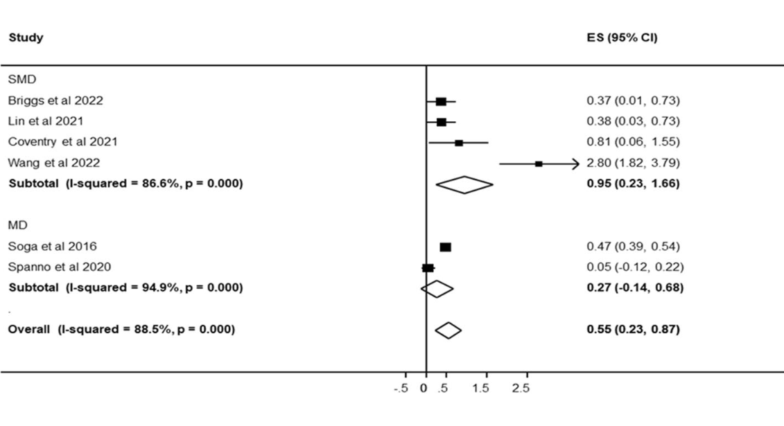 The researchers were able to use 6 studies for their meta-analyses. The figure below - click on it for a larger version - shows the outcome.