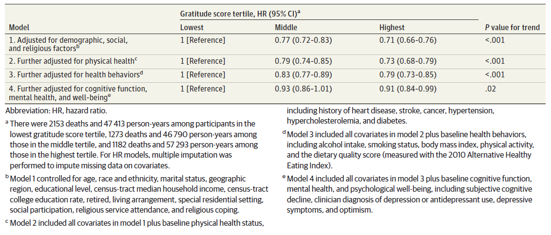 "In addition, gratitude wascorrelated with other facets of psychosocial functioning, such as greater purpose in life and social support, which have been linked with increased longevity."