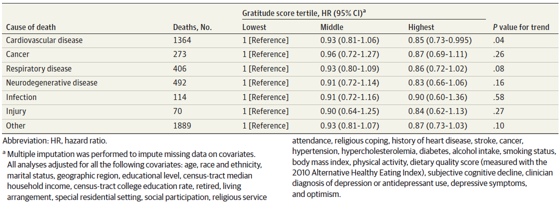 "The literature suggests that gratitude is inversely associated with risk factors of mortality", the write. "For instance, greater gratitude was associated with favorable profiles of cardiovascular biomarkers, such as endothelial function, prognostic inflammatory markers, and lipids, and greater adherence to healthy lifestyles (eg, diet, exercise, medication adherence)."
