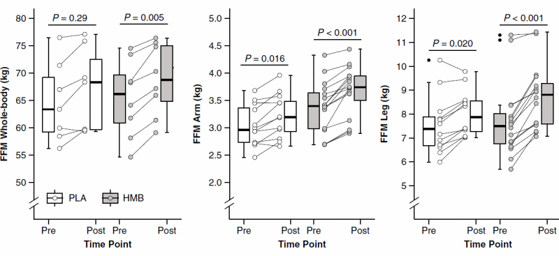 Both groups built up lean body mass - say, muscle - but the increase in lean body mass was more convincing among HMB-plus-whey users [HMB] than in the group that had only used whey [PLA].