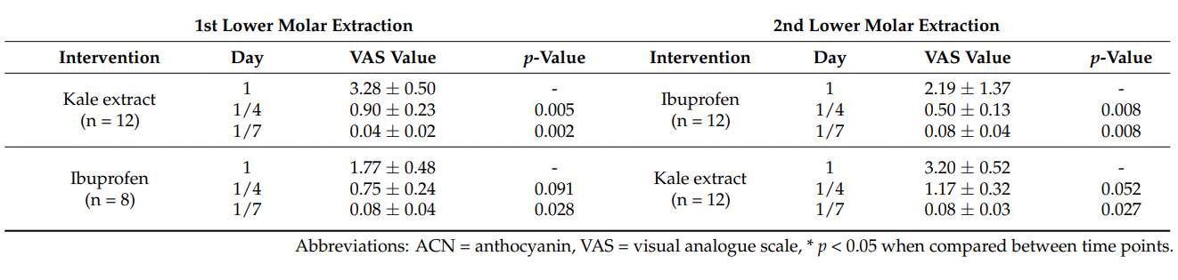 On the first day after the wisdom teeth extraction, the subjects in the ibuprofen group had less pain than the subjects in the kale group, but in the following days the pain decreased equally in both groups. This decrease in pain was even slightly more convincing in the kale group.