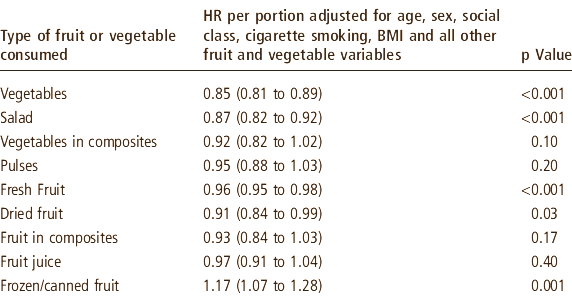 The researchers also looked at different types of fruit and vegetables, and discovered that the positive health effects of fruit juice were minimal. Tinned fruit actually had a negative health effect. [Table]