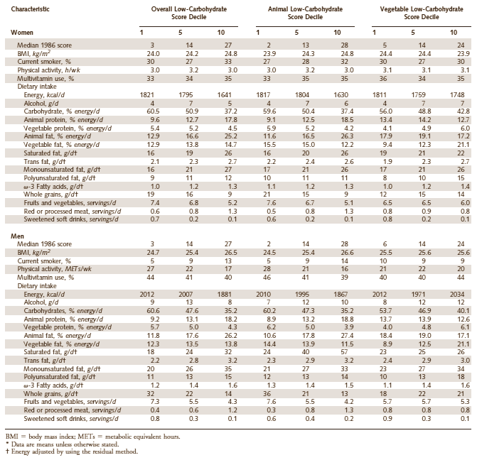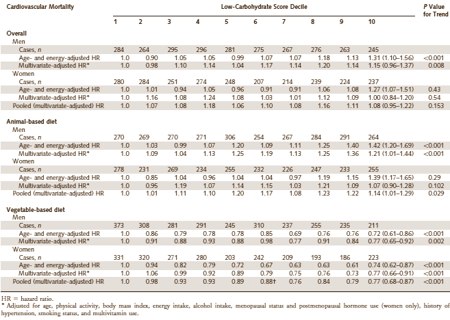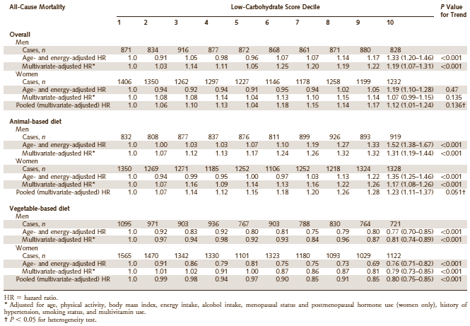 A low-carb diet was not healthy. The negative effect was not terribly alarming, but the mortality in decile 10 was several dozen percent higher than in decile 1. In the participants who had a low-carb diet consisting mainly of animal products the negative effect was a little stronger – but in the participants who ate a plant-based low-carb diet, the negative effect was absent. In fact, the mortality in this group was actually lower. If you click on the table below a larger version will appear.