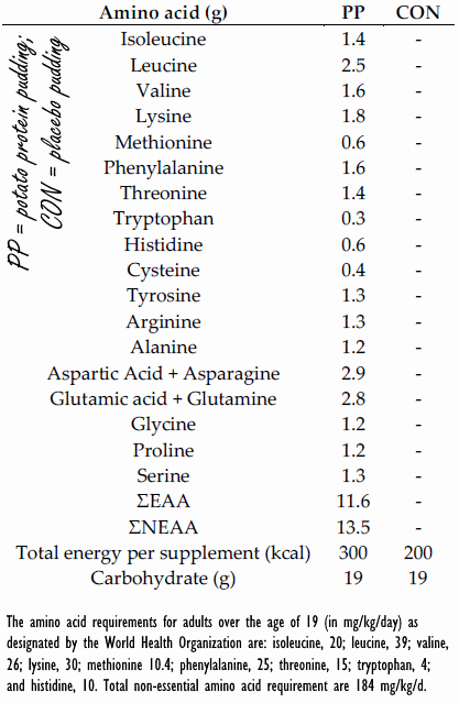 The women in the experimental group received the same amount of protein through their regular diet. But they also ate a pudding twice a day that contained 25 grams of potato protein. So throughout the day the women consumed 50 grams of potato protein. In total, these women consumed 1.6 grams of protein per kilogram of body weight daily. [PP]