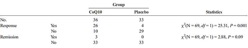 More telling is the table below. Click on it for a larger version. The table shows the number of responders in both groups. In the Q10 group, 72 percent of the subjects were a responder, in the placebo group only 12 percent.