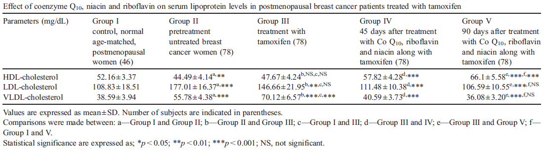 "Co-administration with Co-Q10, riboflavin and niacin significantly decreased the tamoxifen induced lipid abnormalities."