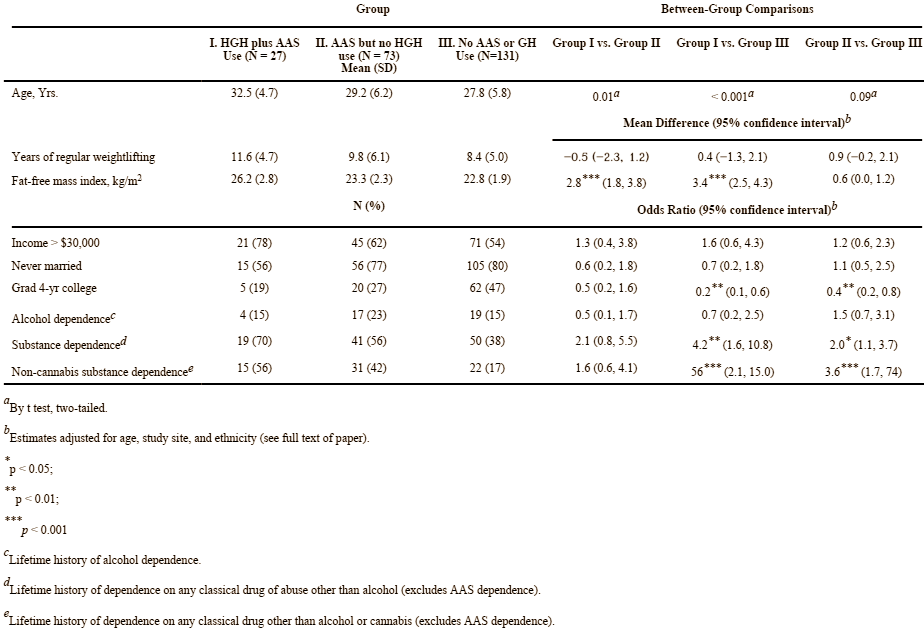 Growth hormone is probably effective, the researchers discovered: the growth hormone users had more lean body mass than those who used steroids only. Their FFMI was higher, as the table below shows. The table also shows that the chance of becoming addicted to substances steroids but also recreational drugs was a factor 5.6 higher among growth hormone users than among natural athletes. Part of the table is reproduced below. Click on the table for the full figure.