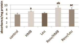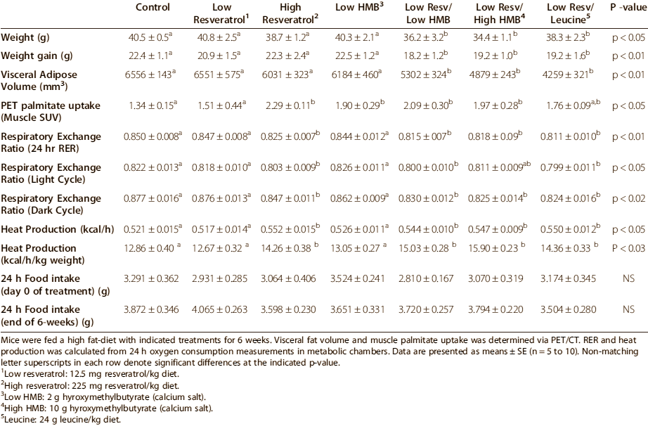 In the animals that had been given both leucine/HMB and resveratrol, the insulin level went down and the muscle cells' glucose uptake increased. [Table]