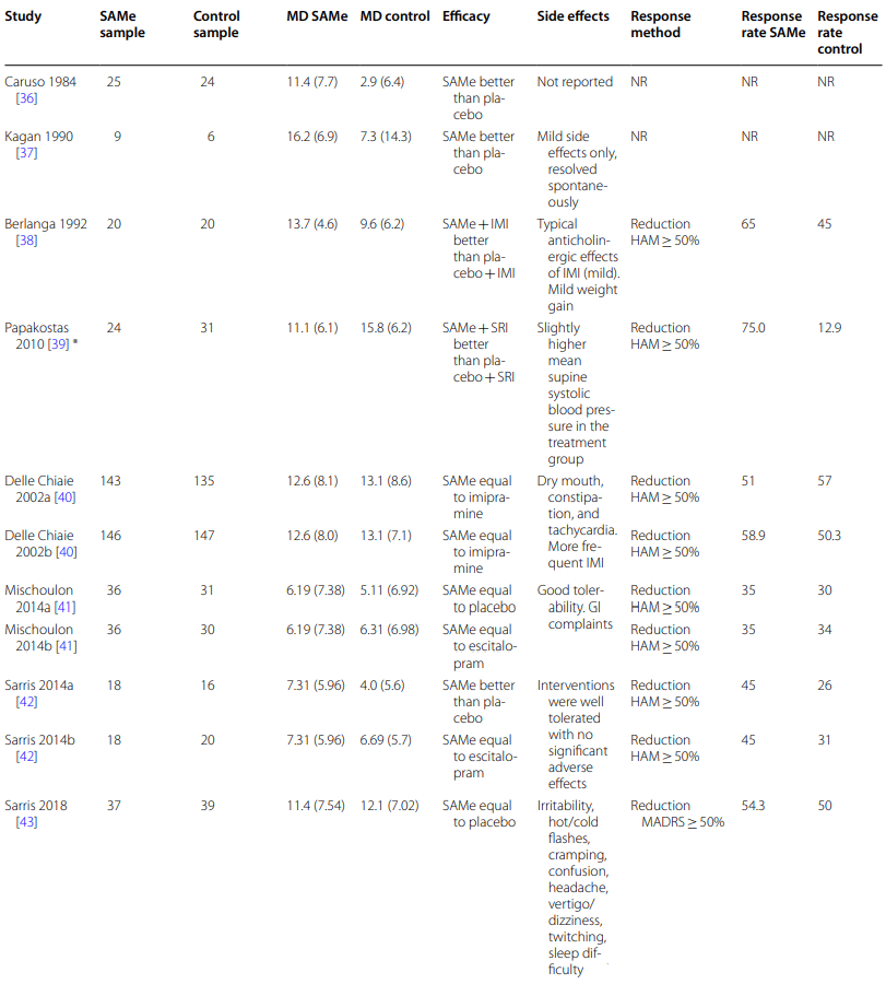 4 trials concluded that SAMe performed as well as a pharmacological antidepressant. 2 trials saw no difference between SAMe and a placebo.