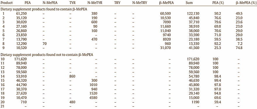 It looks as though many Acacia rigidula supplements contain the synthetic phenethylamine. The researchers found high quantities, especially in the supplements that did not contain the amphetamine analogue beta-methylphenethylamine. If you take the maximum recommended dose of supplements 10 and 11, then you'd be consuming 809 and 552 mg phenethylamine daily.