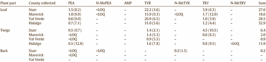 The researchers analysed samples of Acacia rigidula. A simplified version of the results is shown below. Click here for the complete table. The researchers found no trace of amphetamines. That's not so surprising: as far as biochemists know, amphetamine is not a substance that occurs in nature. The 1998 study is the only report of analysts having found amphetamine in a natural product.