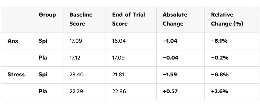 These shifts had little clinical significance. Even after 12 weeks of supplementation, the subjects in the experimental group continued to suffer from severe anxiety, which hampered daily functioning. Furthermore, the subjects were still struggling with moderate stress after 12 weeks of supplementation.
