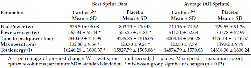 The supplement had no statistically significant effect on average sprint performance, although there was a trend that performance improved after subjects took Cardiose.