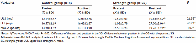 The women who did strength training became stronger - at least, in a period of 30 seconds they were able to make more reps when curling with a dumbbell of 2.3 kg [ULs] and to stand up more often from sitting [LLS]. As a result of the strength training they also scored 20 percent higher on the Montreal Cognitive Assessment questionnaire [MoCa].