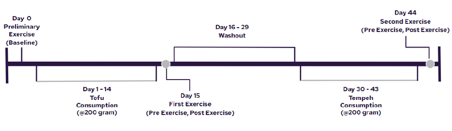 During a two-week period prior to the training, the students in one group consumed 200 grams of tofu daily. During a two-week period prior to the training, the students in the other group consumed 200 grams of tempeh daily.