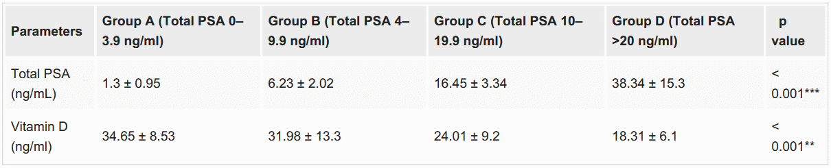 "Hence, a routine biochemistry panel for screening prostate health in men should consider total PSA and vitamin D levels so that individuals deficient in vitamin D are identified and interventional strategies can be planned for their well-being."