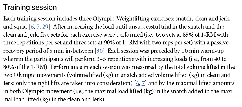 The researchers used nine experienced weightlifters as their subjects, who on two different occasions did a classic weightlifting training session of short sets with very heavy weights. Read more about the type of training they did here.