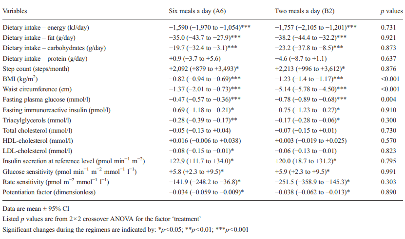 During the period that the subjects ate six meals a day their waist circumference decreased by 1 cm; during the period that they only ate twice a day the decrease was 5 cm.