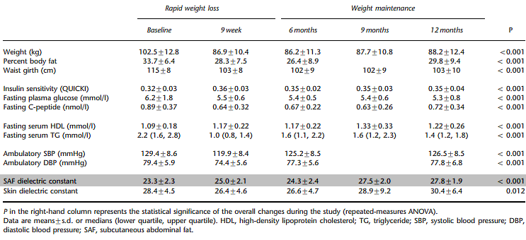 During both phases of the slimming diet, the amount of moisture in the fat mass and the skin increased. This is probably because the sensitivity to insulin had increased, the Finns suspect.